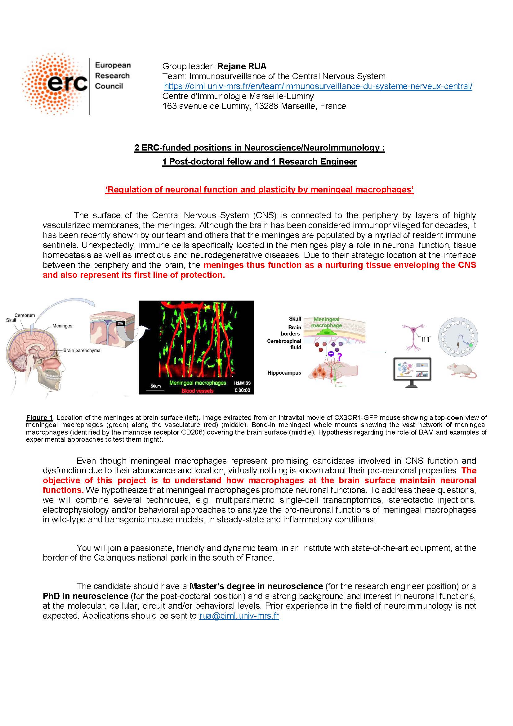 Group leader: Rejane RUA Team: Immunosurveillance of the Central Nervous System https://ciml.univ-mrs.fr/en/team/immunosurveillance-du-systeme-nerveux-central/ Centre d’Immunologie Marseille-Luminy 163 avenue de Luminy, 13288 Marseille, France
